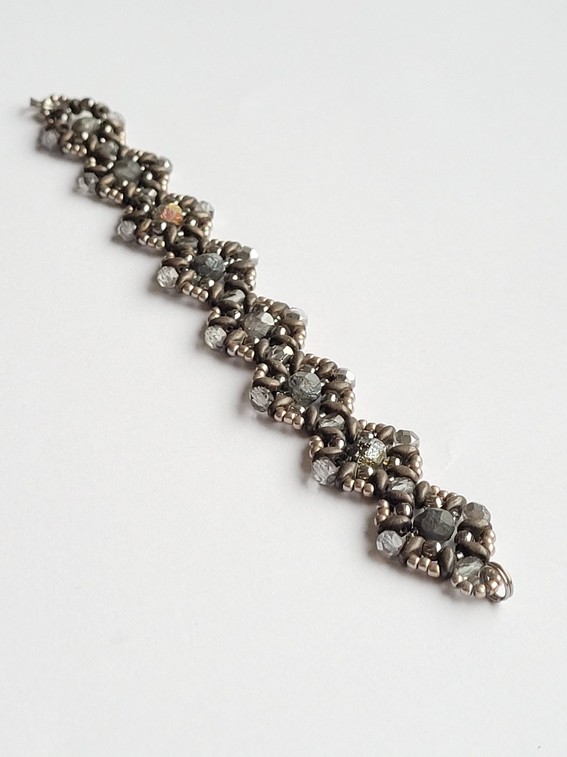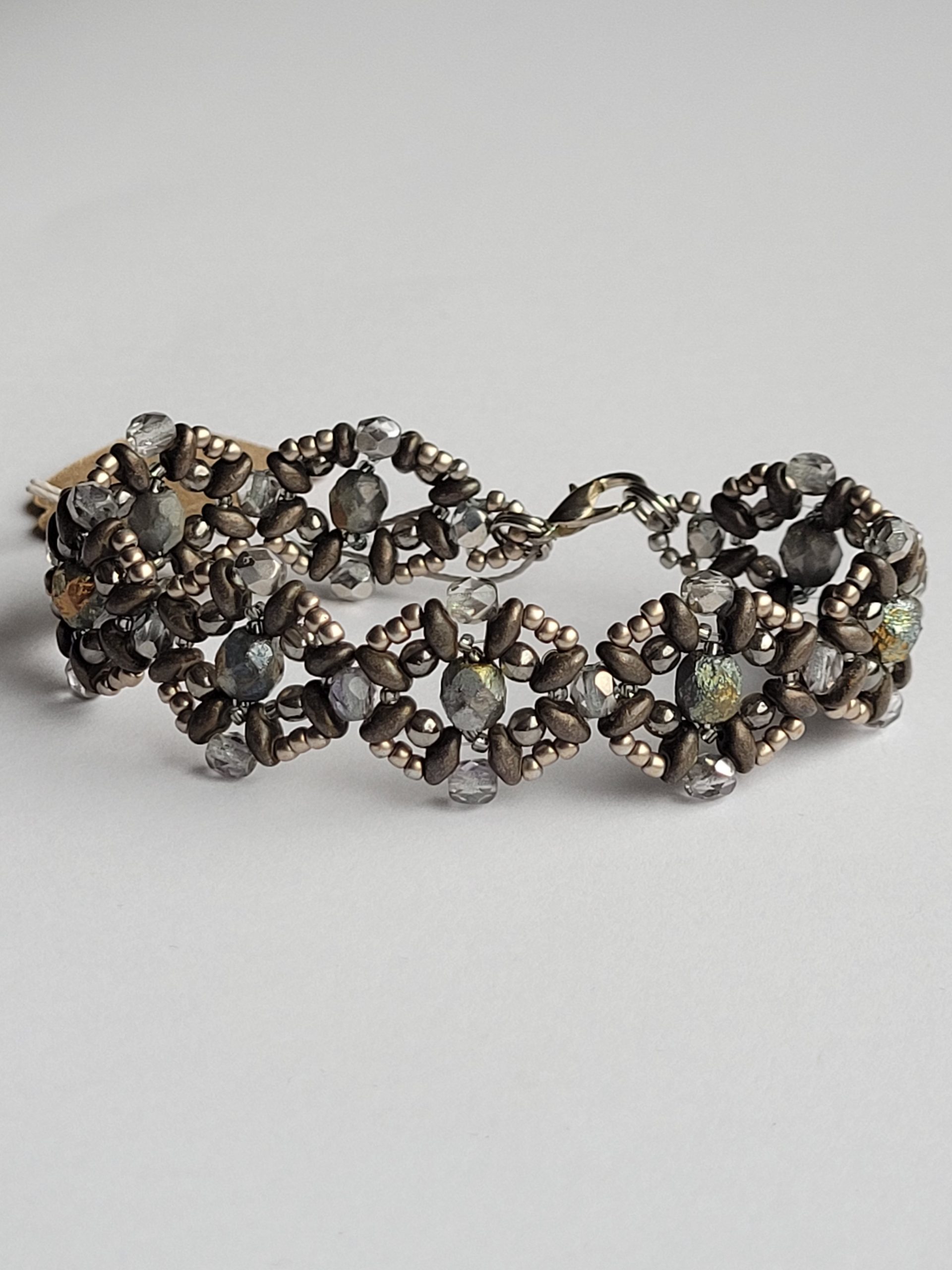 Bransoletka ręcznie wyszywana z ponad dwustu pięćdziesięciu koralików w odcieniach srebra i brązu.