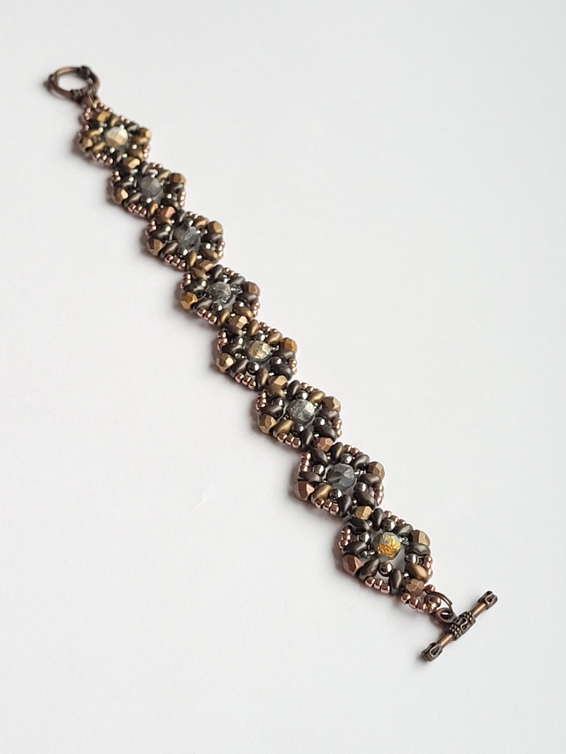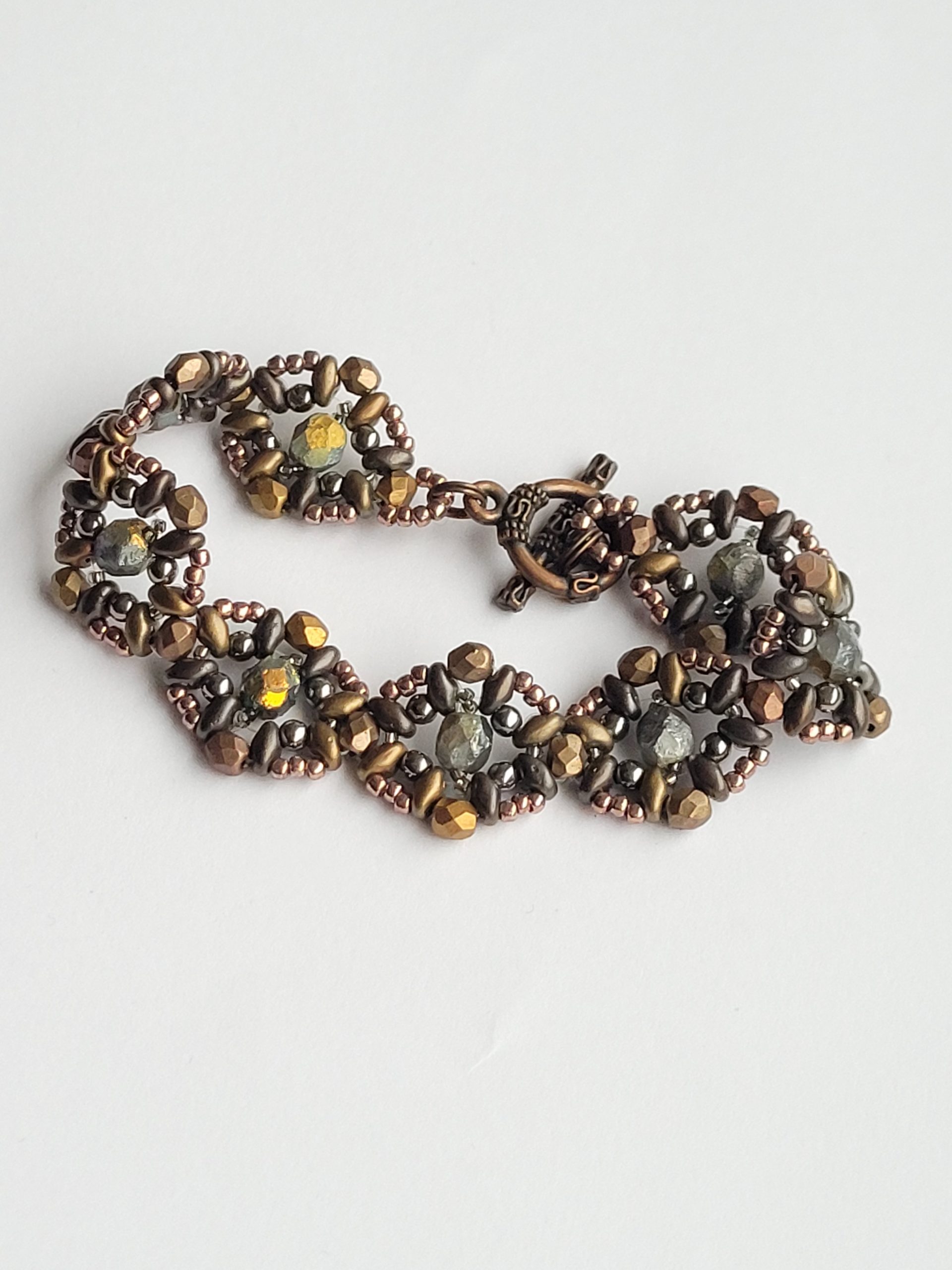 Bransoletka ręcznie wyszywana z ponad dwustu pięćdziesięciu różnej wielkości koralików w odcieniach starego złota i srebra.