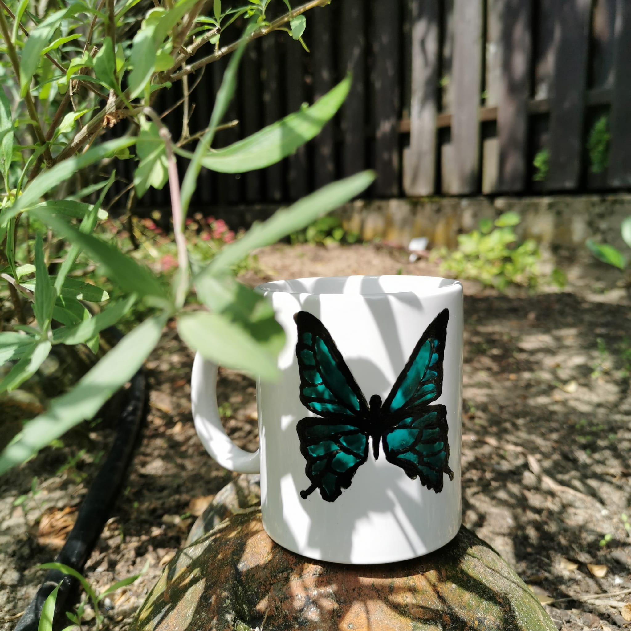 Kubek ceramiczny ręcznie malowany z motylem w kolorze ciemnej zieleni.
