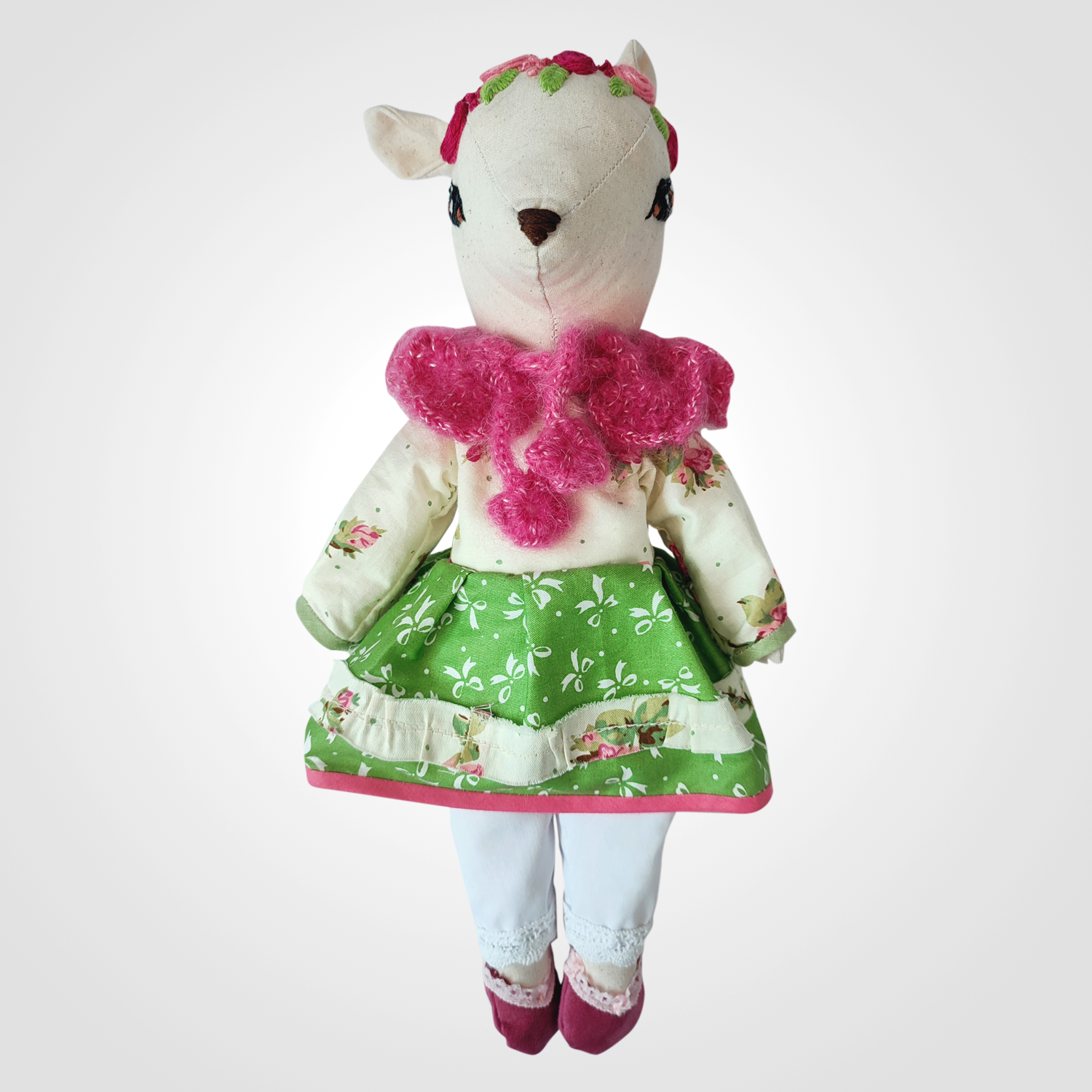 Ręcznie szyta i haftowana przytulanka. Wykonana z dbałością o każdy szczegół według własnego projektu autorki. Ilość pracy jaka została włożona w sarenkę powoduje, że można nazywać ją małym dziełem sztuki. Jednocześnie może być pięknym prezentem na urodziny lub święta i stanowić ukochaną przytulankę z dzieciństwa. Estetyka, gust, smak i właściwości użytkowe w jednym produkcie. Jest taka tylko jedna sztuka. Nie ma dwóch identycznych.